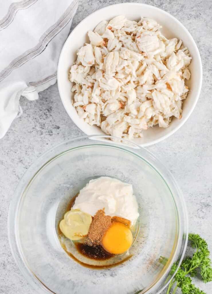 • In another bowl, whisk together mayonnaise, egg, Dijon mustard, Worcestershire sauce, Old Bay seasoning, parsley, and lemon juice.