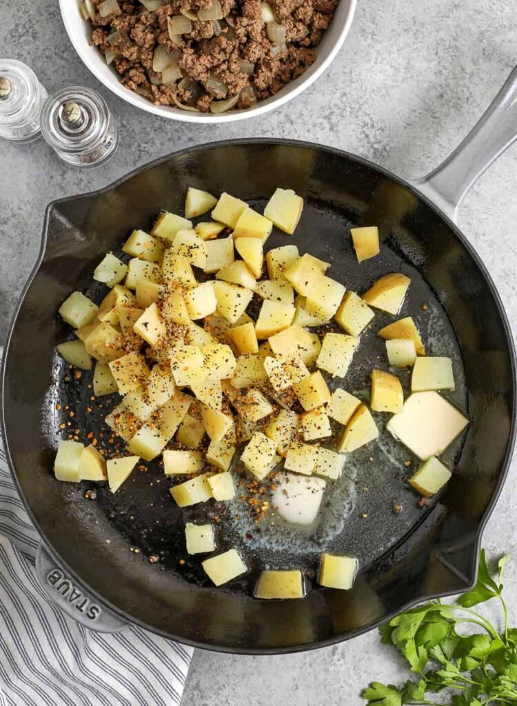 You can dice the potatoes and chop the onion a day ahead to save time. Store them in sealed containers in the refrigerator so everything is ready to cook quickly when dinner time arrives.