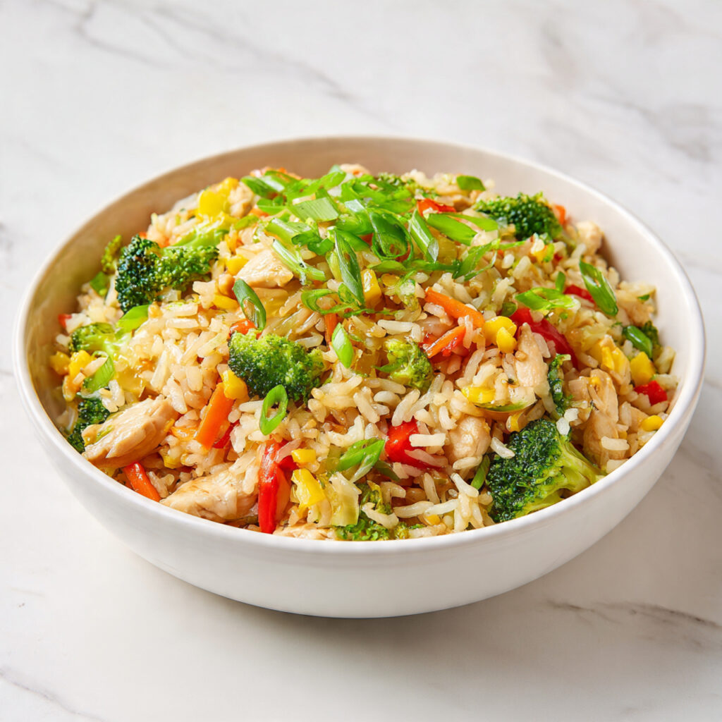 minutesA simple skillet dinner with tender chicken, vegetables, and warm rice tossed in a light savory sauce. It’s quick to make, comforting, and perfect for busy weeknights.