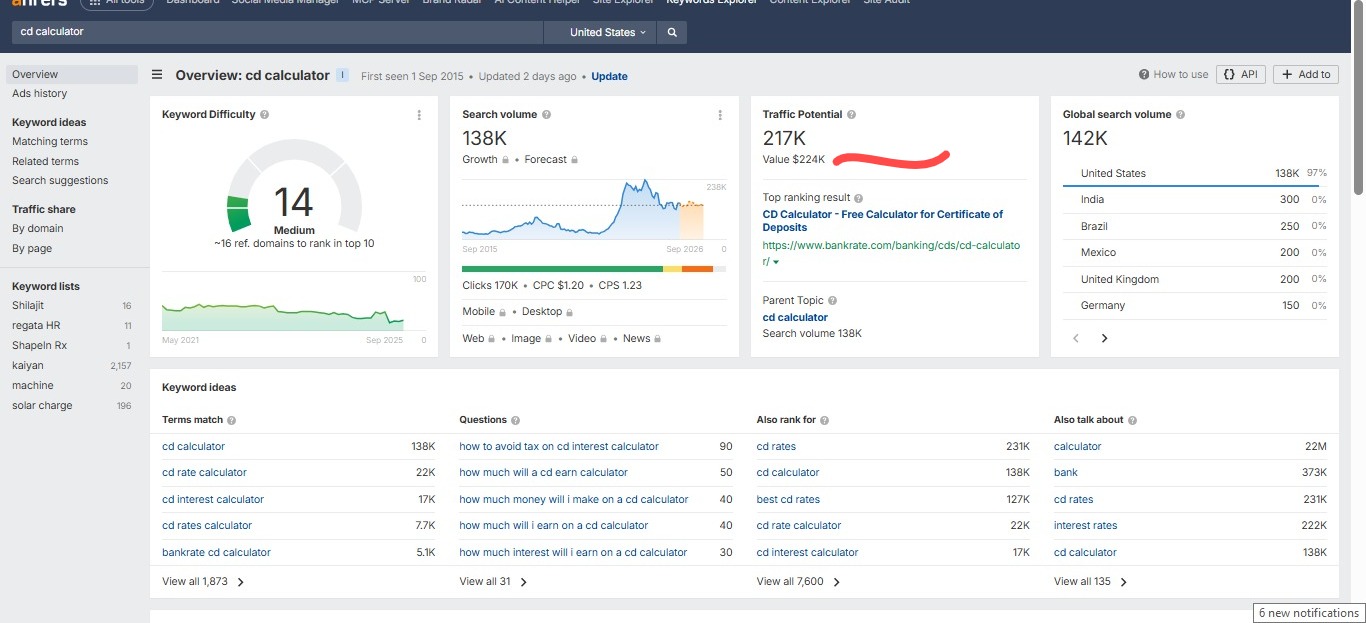 High-demand tools: Financial calculators like CD Calculator have huge traffic potential (the current top-ranking site earns over $214,000 in traffic value monthly).